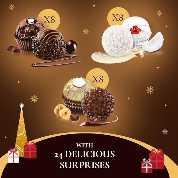 - Chocolate Advent Calendar 2025: Rich Assortment of Favourites: Fine Assorted Confections Ferrerro Rocher – Whole Hazelnut in Milk Chocolate and Nut Croquante Confetteria – Crisp Coconut Speciality with Smooth Coconut Filling and a Whole Almond Ferrerro Rondnoir – Fine Chocolate Covered Speciality with a Dark Chocolate Centre in Smooth Filling