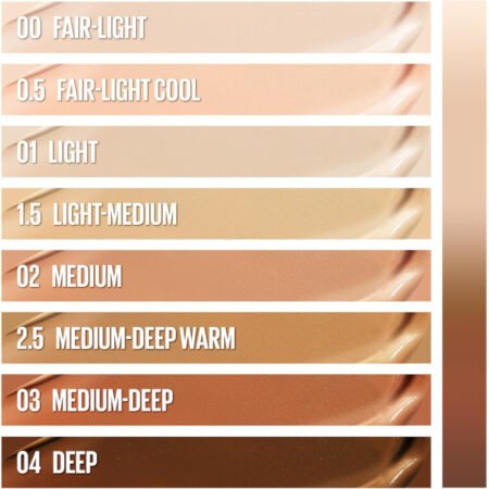 | Color | 030 Porcelain, 040 Light Ivory, 095 Ivory, 097 Golden Ivory, 100 Fair, 101 Ivory Beige, 102 Pastelle, 103 Soft Sand, 104 Warm Almond/Vanilla, 105 Soft Beige, 106 Natural Beige, 108 Honey Beige, 109 Natural Bronze, 110 Honey, 111 Deep Beige, 113 Caramel, 120 Tawny, 130 Mahogany, 140 Cocoa, 150 Espresso |