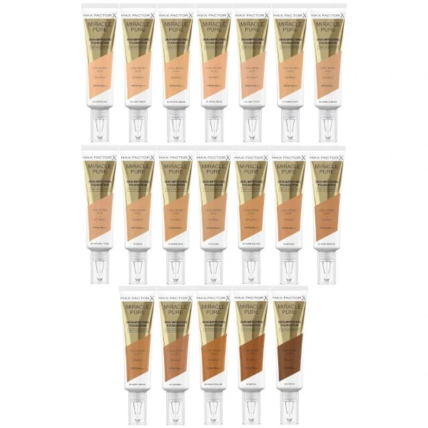 Believe in miracles! Inspired by skincare, mastered by Max Factor, the new Miracle Pure Foundation is clinically proven to care for skin while you wear it. In just one minute and with just a drop it pumps your skin, letting your complexion benefit in five ways, with improved radiance, firmness, elasticity, density, and suppleness. The advanced formula is infused with 89% skin-care ingredients including, Vitamin C and Hyaluronic Acid, and provides 24 hours hydration.