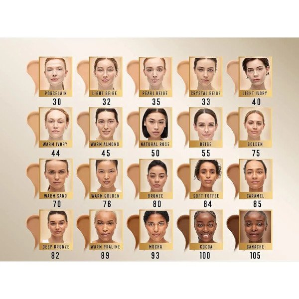 | Color | 100 Cocoa, 30 Porcelain, 33 Crystal Beige, 70 Warm Sand, 76 Warm Bronze, 80 Bronze, 82 Deep Bronze, 84 Soft Toffee, 85 Caramel, 93 Mocha |