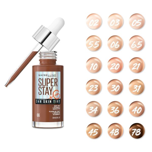 Introducing the non-stop super drop, Super Stay up to 24H Skin Tint Foundation! Vitamin C* infused vegan formula*** brightens and delivers beautiful skin-like coverage that lasts all day. 95 % said skin looks healthy**. Weightless feel. Resists sweat, humidity and fading. Suitable for all skin types, even sensitive skin. *Vitamin C derivative **In a consumer test. After 4 weeks of daily use. *** Vegan formula: No animal derived ingredients or by-products