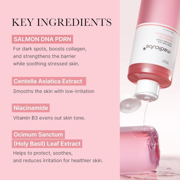 Medicube PDRN Pink Cica Soothing Toner (250ml) is a dermatologist-tested, multi-functional toner formulated to calm, hydrate and brighten sensitive or irritated skin. Infused with regenerative Salmon PDRN, this advanced formula helps stimulate skin cell renewal and fortify the skin’s barrier, while Centella Asiatica (Cica) reduces redness and soothes inflammation. Lightweight and fast-absorbing, it delivers deep hydration without clogging pores, making it ideal for daily use on even the most delicate skin types.
